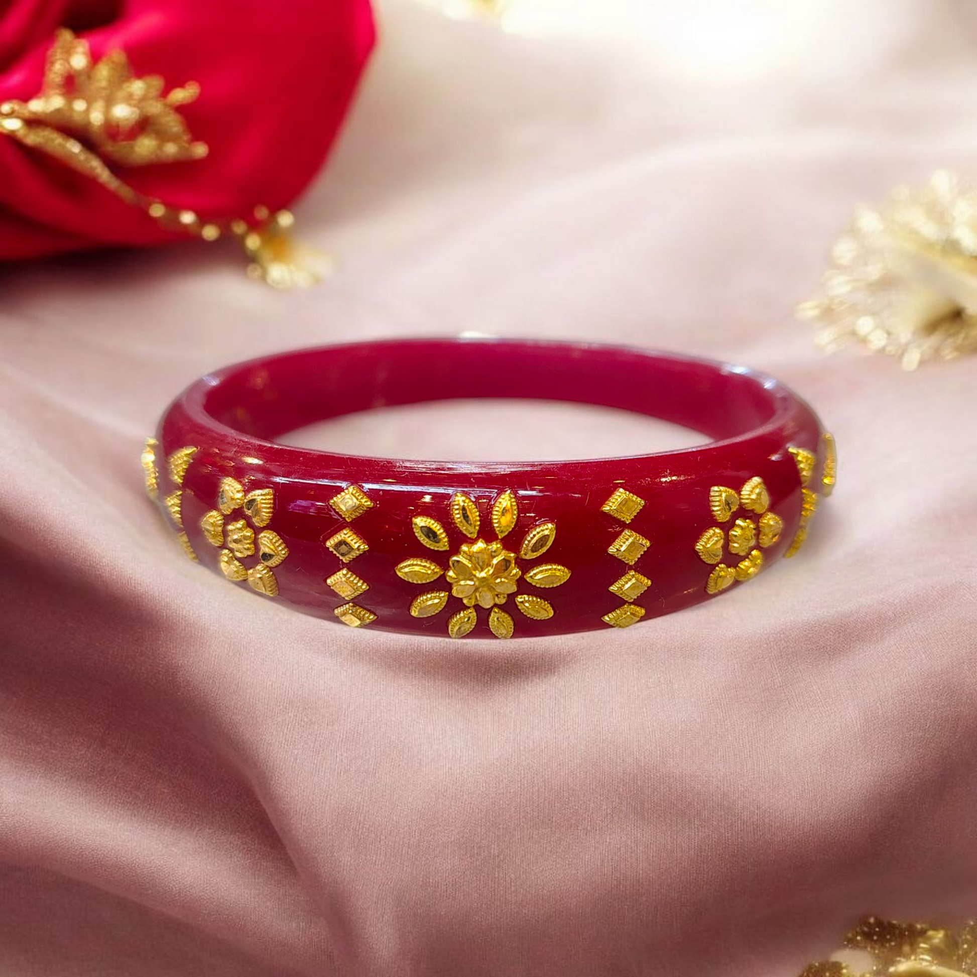 (GBP50) RAJLAXMI (MTO) ELEGANCE DESIGN RED COLOUR (50 TONCH) KDM GOLD BRACELET POLA 1 PIECE FOR MARRIED WOMEN (REGULAR USE) APPROX WGT: 0.400 GM SOLD ON MRP BY MAHALAXMI.