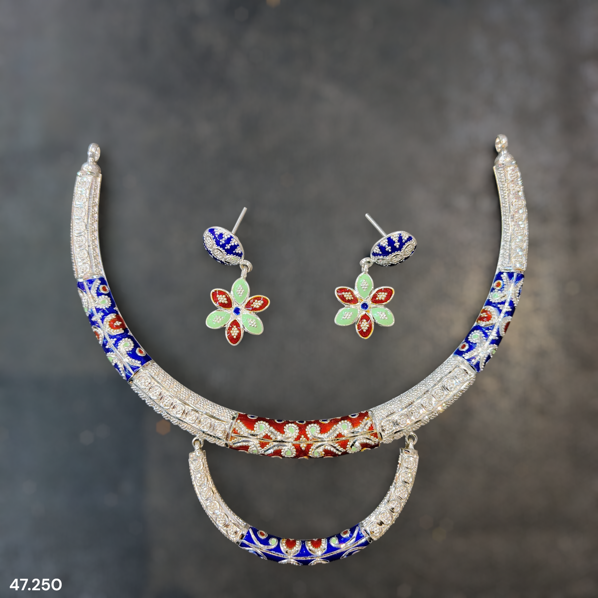 SILVER NECKLACE- CERTIFIED HALLMARK 925 SILVER HASULI NECKLACE 1 PIECE WITH EARRINGS (MINAKARI MANIPUR DESIGN) APPROX WGT: 47.250 GM (1 PIECE) FOR BEAUTIFUL WOMEN.