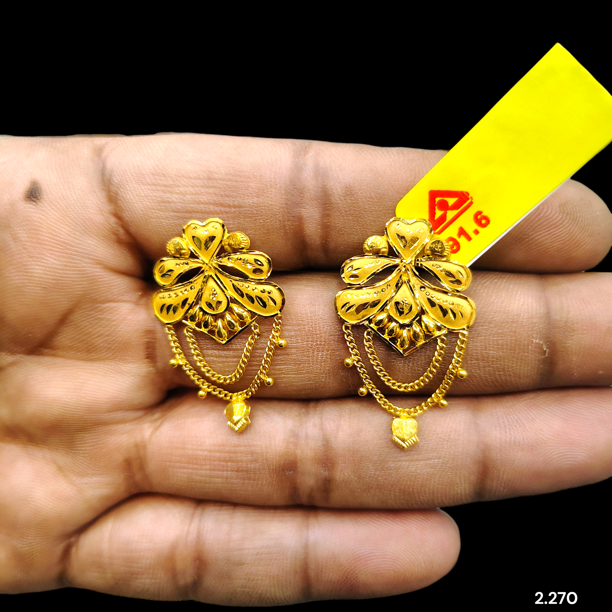 (GER22) BIS CERTIFIED WGT: 2.270 GM APPROX HUID HALLMARK 916 22KT GOLD EARRINGS KANBALA 1 PAIR FOR WOMEN.