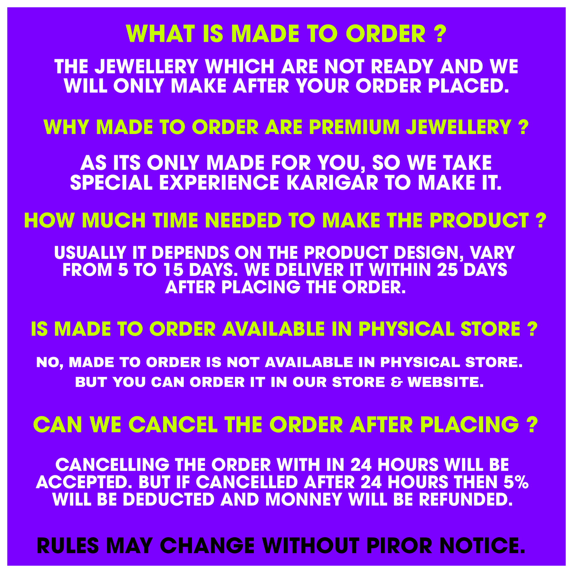 THIS IS A MADE TO ORDER ITEM AND WILL BE MADE FOR YOU AND DISPATCH WITH IN 20 DAYS FROM THE DATE OF ORDER. THIS JEWELLERY WILL BE MADE ONLY FOR YOU AS PER ORDER AND CAN'T BE CANCELLED AFTER PLACING ORDER.